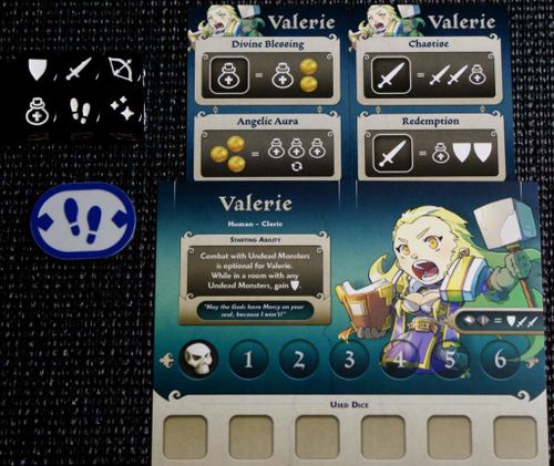 Помимо стандартных применений кубиками можно активировать отображенные на карте героя навыки и доступные в определенных комнатах дополнительные взможности. Если же жизни героя упадут до нуля, он временно выбывает из игры, теряет имущество и часть опыта и на следующий ход возвращается.