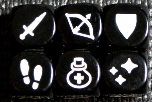 Кубики Масморры. Символы слева направо: ближний бой, дальний бой, щит. В нижнем ряду - движение, лечение и магия