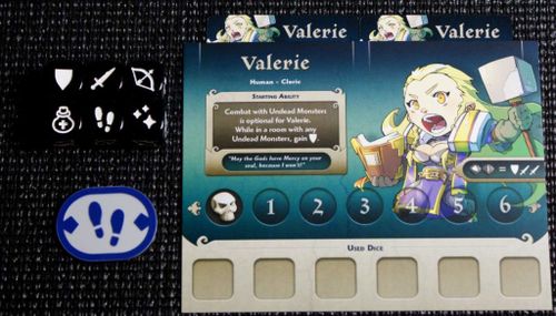 Еще за счет соответствующих символов герой может восстанавливать жизни целебными эликсирами и применять магию, чтобы изменить выпавший на другом кубике результат на выбранный. Самое важное происходит, когда герой оказывается в одной комнате с монстром. В бою применяются символы ближнего боя, дальнего боя и защиты (щиты). За счет своих кубиков герой пытается нанести монстру урон, равный или превышающий его показатель защиты.