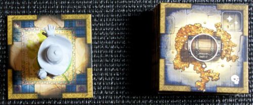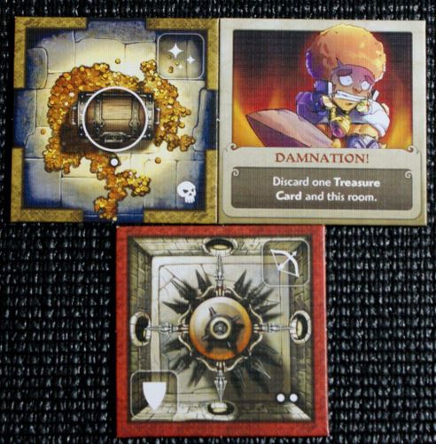 Примеры тайлов: слева - стандартный. Справа - проклятие. Внизу - ловушка; ее можно дезактивировать, выложив в комнату кубики с символами щита и дальнего боя, за дезактивацию герой получит 2 опыта (две точки). Соответственно за вскрытие сундука он получит 1 опыт (одна точка)