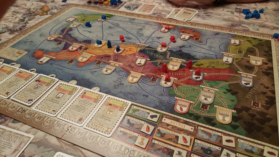 У нас есть карта Европы с городами, соединёнными разноцветными железнодорожными путями. И мы строим перегоны. Всё просто — в свой ход игрок либо добирает карты, либо строит перегон, получая за это ПО. Также ПО игроки получат в конце игры за выполненные маршруты.