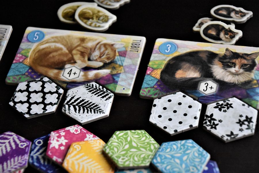 Вторая же — сыграна на 4 игроков! И с тремя новичкам! Тут победа осталась за мной, хотя и остальные выступили отлично. Партия доказала, что «Котики» — не та игра, в которой новички проигрывают с разгромным счётом, не имея шансов на победу, и это прекрасно! На четверых — борьба за нужные лоскуты идёт полным ходом, и если хотя бы двое игроков сцепились в борьбе за лоскуты с одним узором - у остальных практически нет шансов, что им они достанутся.