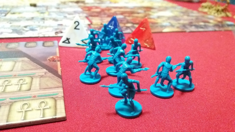 Этим мне существа «Кемета» понравились больше «Кикладовских» — они более толковые, практичные и все представлены фигурками. Они не ждут на вашей территории, пока кто-то нападёт, и не умирают в конце раунда — существа «Кемета» идут в бой с вашими воинами, сражаются и умирают вместе с ними. Будто они ваши верные питомцы. Это играется и выглядит очень круто.