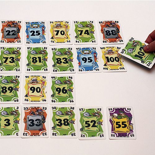 Тогда: простая игра на составление рядов по увеличению-уменьшению значений чисел. Чем длиннее ряд, тем больше очков за него получаешь. Если же ряд слишком короткий - штраф. Сыграли очень много партий ещё до того как начал вести учёт сыгранному. Первый экземпляр затёрли до дыр.