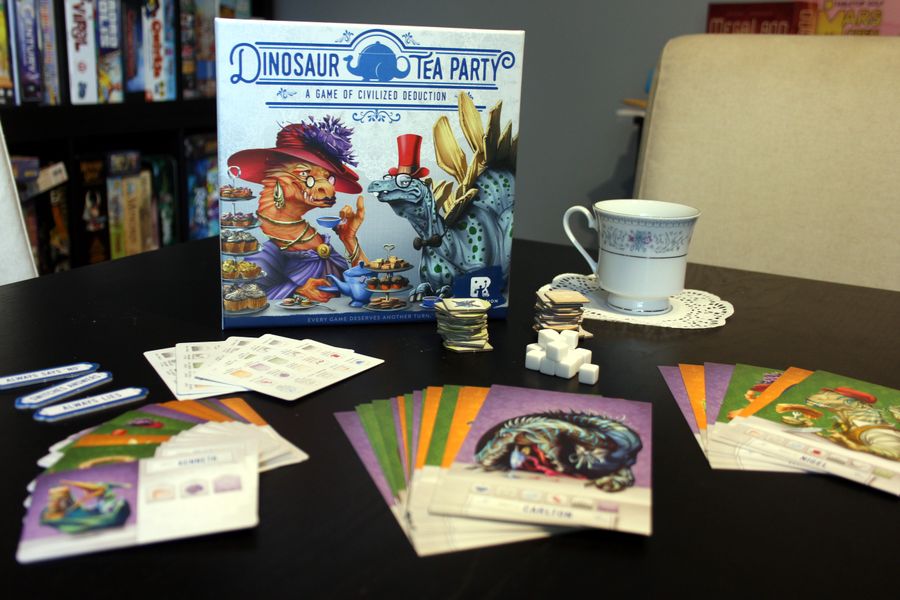Несложная и быстрая игра на дедукцию. В игре — 2 набора карточек с портретами динозавров. У каждой рептилии присутствует или отсутствует набор признаков (шляпа, очки, хвост, пятна, питомец, чашка и т. д.). Один набор карт выкладывается в открытую на стол. Из второго набора игроки получают взакрытую по одной карте — за этого персонажа они и будут играть. Поочерёдно задавая друг другу вопросу, участники стремятся угадать чужого персонажа. Чтобы не запутаться, каждый игрок, отвечая на вопросы, выкладывает перед собой жетоны, обозначающие наличие или отсутствие у его персонажа названных признаков. Сравнивая выложенные жетоны с портретами пришедших на чаепитие, участники отгадывают динозавров друг друга. Карта отгаданного персонажа выходит из игры, и ставки растут.