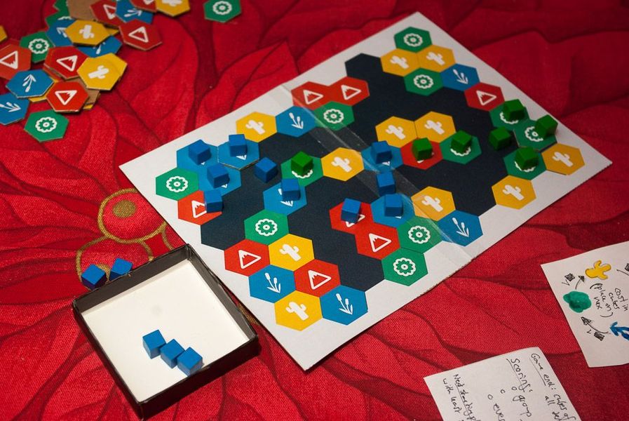 Экпрсесс-игра про преображение земель и строительство, навеянная её автору «Террой Мистикой». Будучи большим фанатом последней, я обратил на BGG внимание на «Бриз», перевёл правила и сделал себе экземпляр игры. Здесь нет разнообразия рас и зданий, но сохранились разные ландшафты, которые надо «переделывать под себя». Фишки-кубики выступают одновременно и как рабочие, и как здания. Игроки соревнуются в успешности застройки. Игра очень быстрая, без каких-то изысков. Можно использовать для обучения подобным типам настолок. После знакомства с «Бризом» я остыл по отношению к экспресс-настолкам (например, перевёл, но не стал печатать экспресс-игру по мотива «Покорения Марса»).