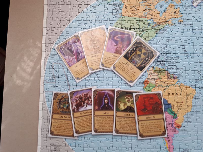 Сыграли в «Плоский мир» несколько десятков партий, накопилась статистика по победам персонажей. Принял решение поискать дополнительные варианты персонажей. (А ещё появилась задача играть впятером.) На форуме БГГ посмотрел разные варианты, отобрал, перевёл, нарисовал и распечатал. Результат очень нравится, играем только с дополнением.