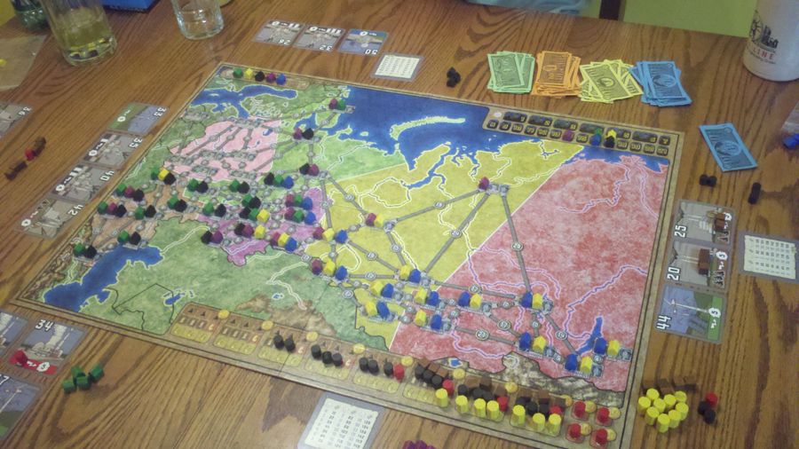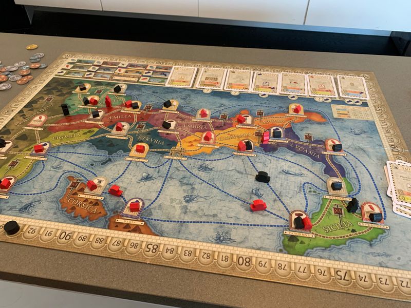 Сейчас: регулярно раскладываем игру 3-5 раз в год разным составом. Допечатал несколько карт, преимущественно на 2-3 игроков (Корсика, Крит). На них отлично играть вдвоём - острое соперничество за города, нет никаких "я строю на севере, а ты - на востоке". Возникла мысль творчески переработать какую-нибудь карту и превратить, например, Корсику в Свердловскую область.