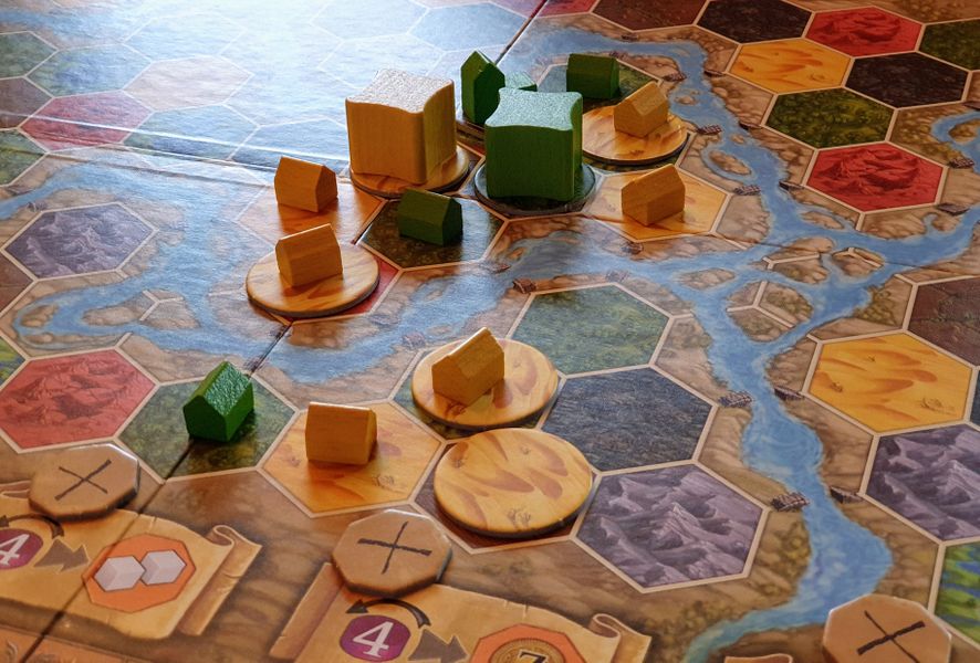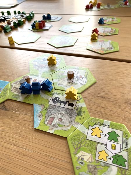 Тогда: экономика, строительство деревни, перевозки, аукционы, тайные цели - всё меняется каждую партию. Оформление в спокойных тонах, целый мешок разноцветных деревянных человечков - "что ещё нужно, чтобы спокойно встретить старость" (с). Нравится острое соперничество, масса скрытой информации - просто отличная игра. Дети играют с 9 лет - в таком возрасте, конечно, непросто держать в голове все элементы, задействованные в партии, и не хватает жизненного опыта для прогноза действий соперников на аукционе, но от форы парни отказываются.
