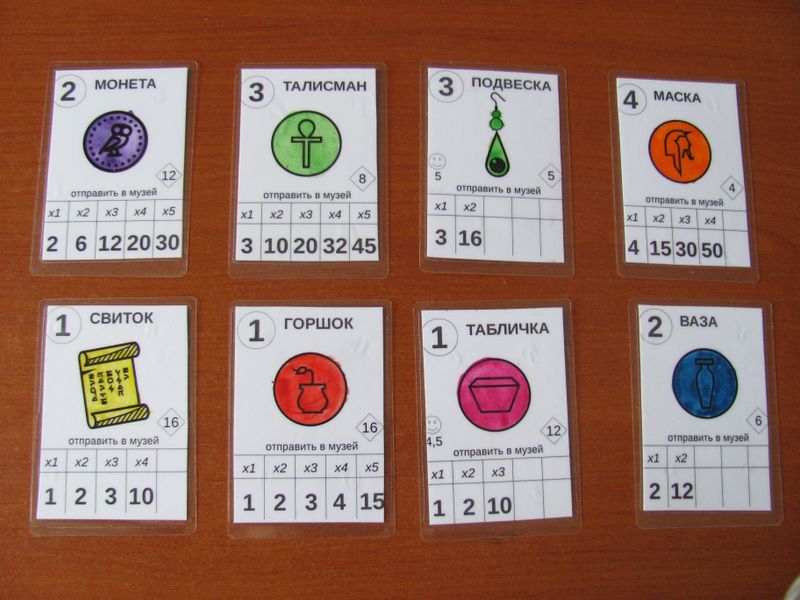 Первый экземпляр "Археологии" мы затёрли до дыр (см. выше - 2010 год). Поэтому никак не мог пройти мимо выпуска обновлённой игры - с новыми сокровищами и сокровищницами. Решил подключить младших детей к изготовлению ПНП (бесплатный детский труд, тащемта). Перерисовал комплект ПНП, распечатал и дал детям раскрасить.