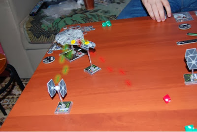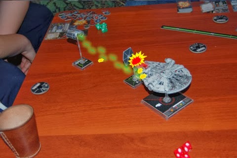 Я рулю Тысячелетним Соколом (стреляет во все стороны+может перебрасывать неудачные атаки) с Люком(может перебрасывать неудачные атаки) и Чубаккой(отмена одного критического попадания) на борту. Ну и конечно, без торпед никак! Против будущих героев Галактики вылетели два TIE-Fighter(Максим) и TIE-Advanced(Катя) с самим Дартом Вейдером на борту. Кораблей конечно маловато, зато почти как в фильме;)).