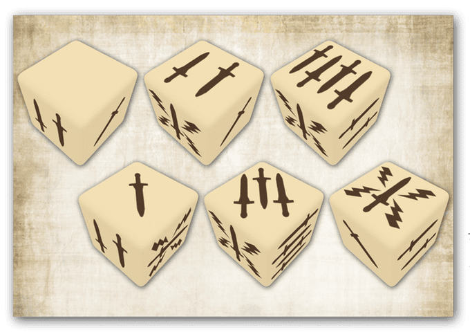 Бой проходит за счёт бросков шестигранных кубиков соответствующих количеством параметром нападения персонажа. Для того чтобы ранить противника нужно достичь значением броска кубика параметра его защиты. При этом кубики с максимальным результатом (5) можно бросать во второй раз , добавляя результат к изначальному. Кубики с низким значением можно использовать как единицы, прибавляя их к значению других кубиков, которые опять же можно перебрасывать если они достигают значения пятёрки. В целом эта система бросков очень динамична, неплохо позволяет регулировать случайность, и даёт потенциальную возможность, даже слабыми отрядами наносить ранения персонажем с высоким параметром защиты, вроде божеств.